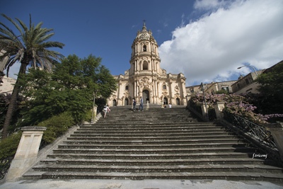 Ragusa Ibla and its newer town sit sprawled out on two hills. Ragusa Ibla has winding streets leading up to the steep, monumental staircase of the Cathedral of Saint George with a huge cupola that is distinguishable from afar thanks to its cobalt blue windows, renderd famous thanks to Andrea Camilleri's Inspector Montalbano.